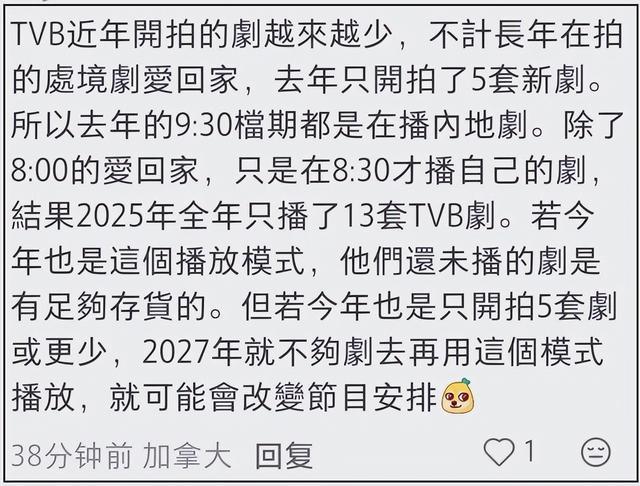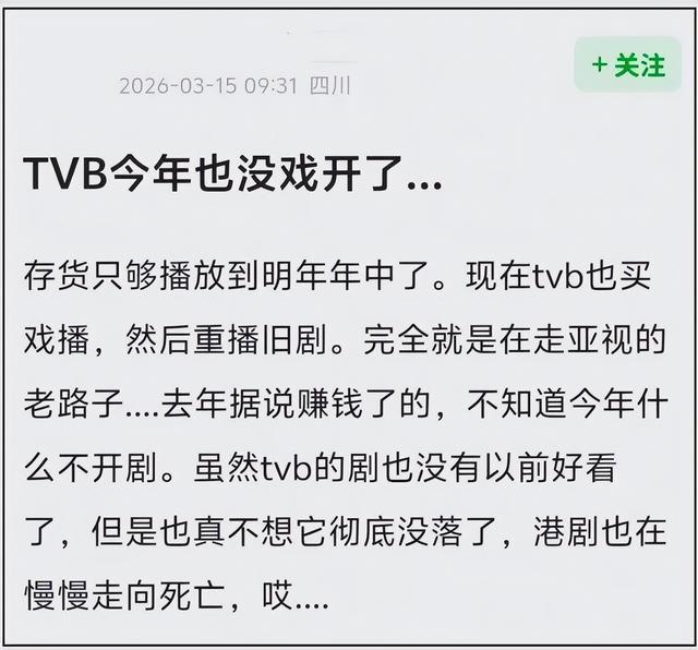 2026 年已过三月,TVB 连一部新剧的开机消息都没有,网友扒出其自制剧存货仅够播到 2027 年年中,更扎心的是,这还是在疯狂重播老剧、外购内地剧填档的前提下。