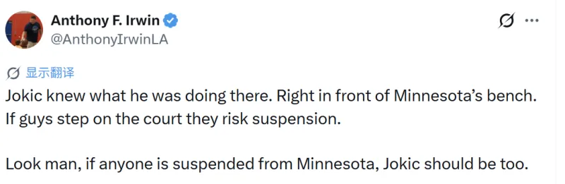 湖人记者Anthony F. Irwin更推写道:“约基奇知道自己当时在做什么。那就在森林狼替补席正前方,如果有球员踏进场内,他们就有被禁赛的风险。